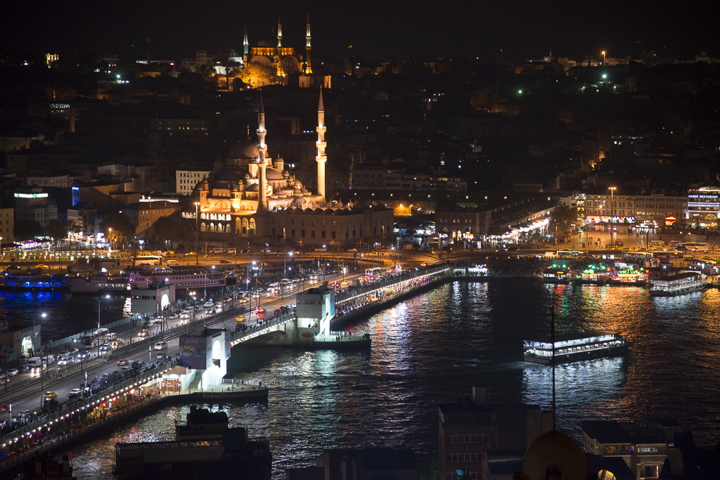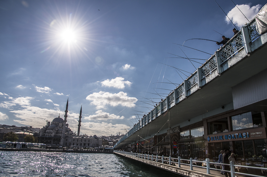 Another river-looking body of water subdivides the “new” and old parts of the European side. The double-decker Galata Bridge joins the two. Cars and fishermen are on the top level; restaurants on the bottom. So as you sit and eat, you watch bait and lures drop down from above, then wriggling fish being hoisted back up to the top layer.