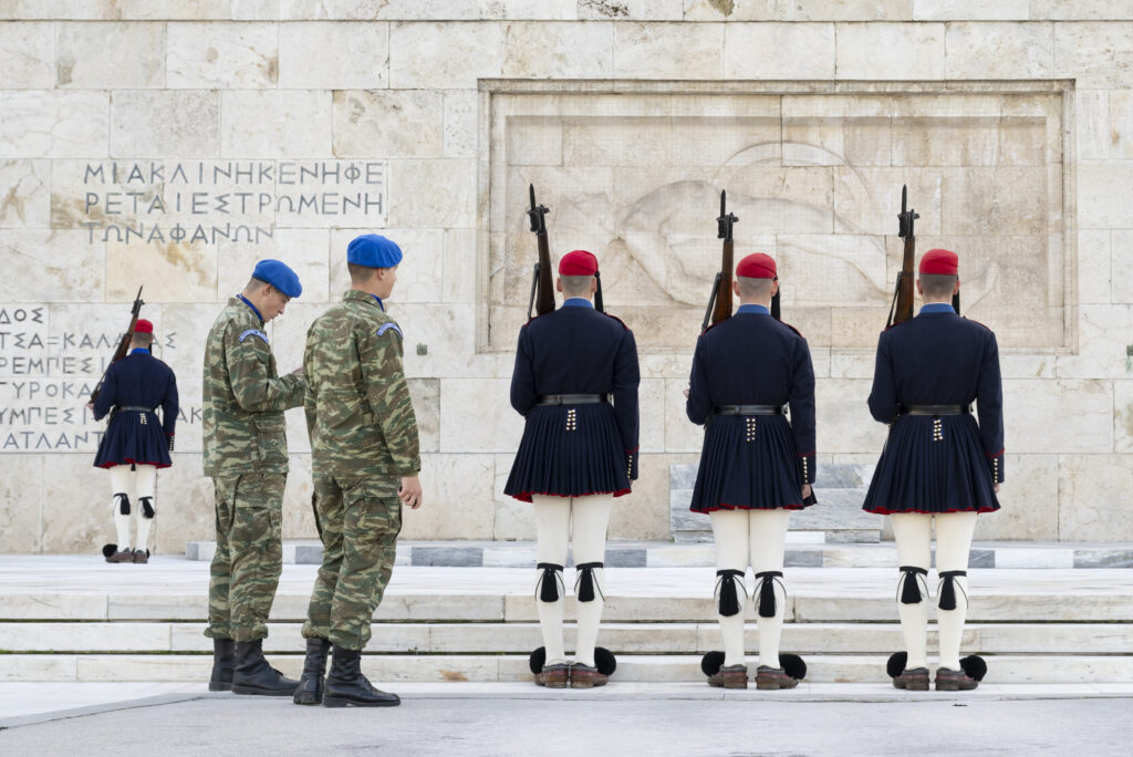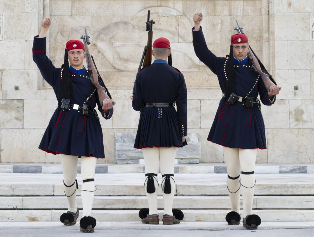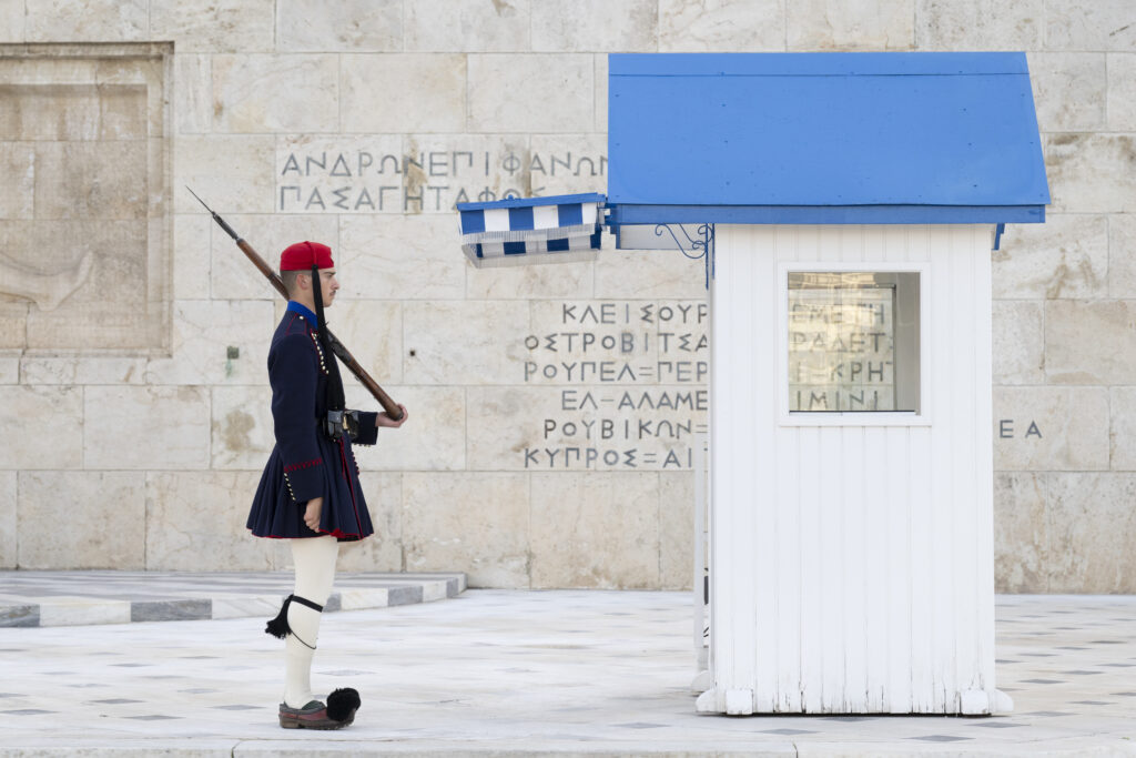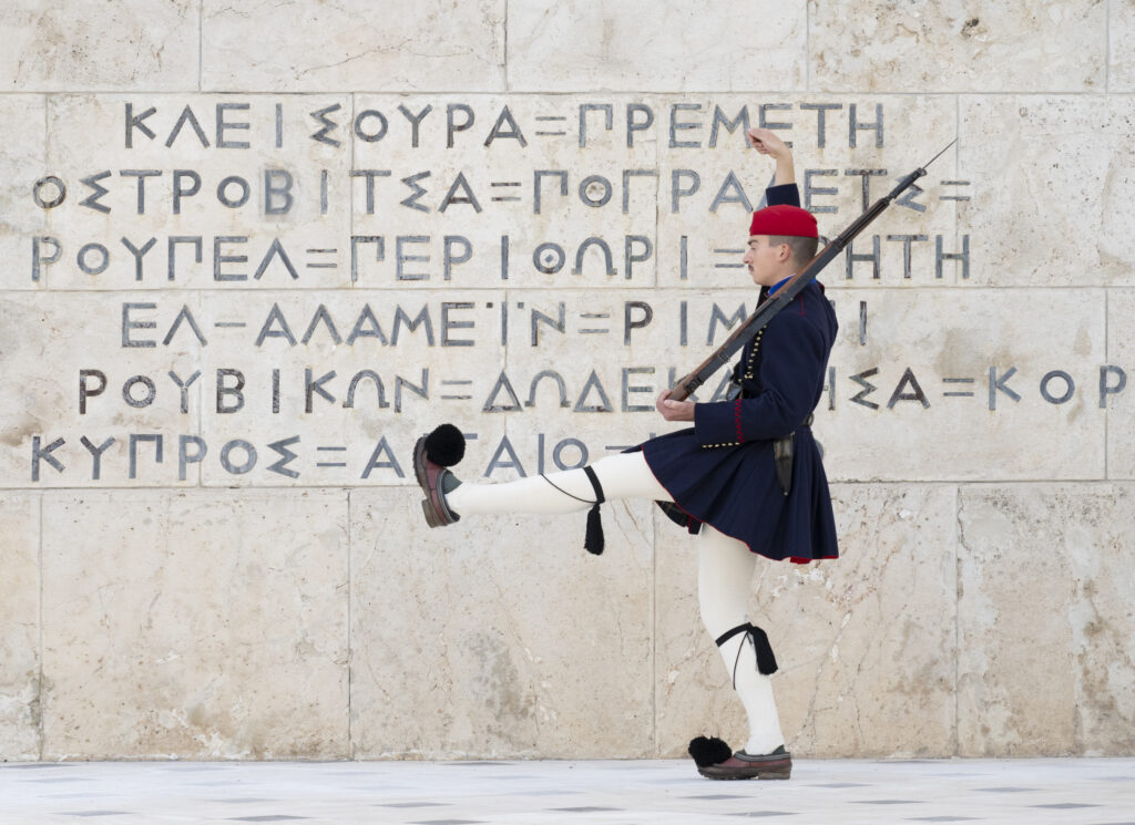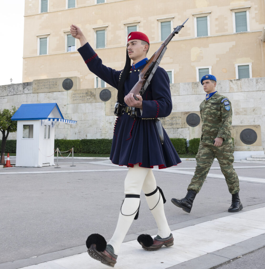 Many countries have some sort of tribute to unknown soldiers killed in the nation’s historical wars. Greece’s is in downtown Athens, right next to their Parliament building. As the sculpture on the wall behind it reminds us, Greek warriors have been fighting wars for a very long time. So when the Greeks think about their historical, noble warriors, they may well be thinking about the Trojan War, or about the 300 Greek “Spartans” who fought at Thermopolea 2500 years ago. Apparently today it’s quite an honor for a Greek soldier to don the traditional uniform and do the high-stepping ceremonial march. At 8am on a weekday, I was pretty much the only person there to watch this changing of the guard.